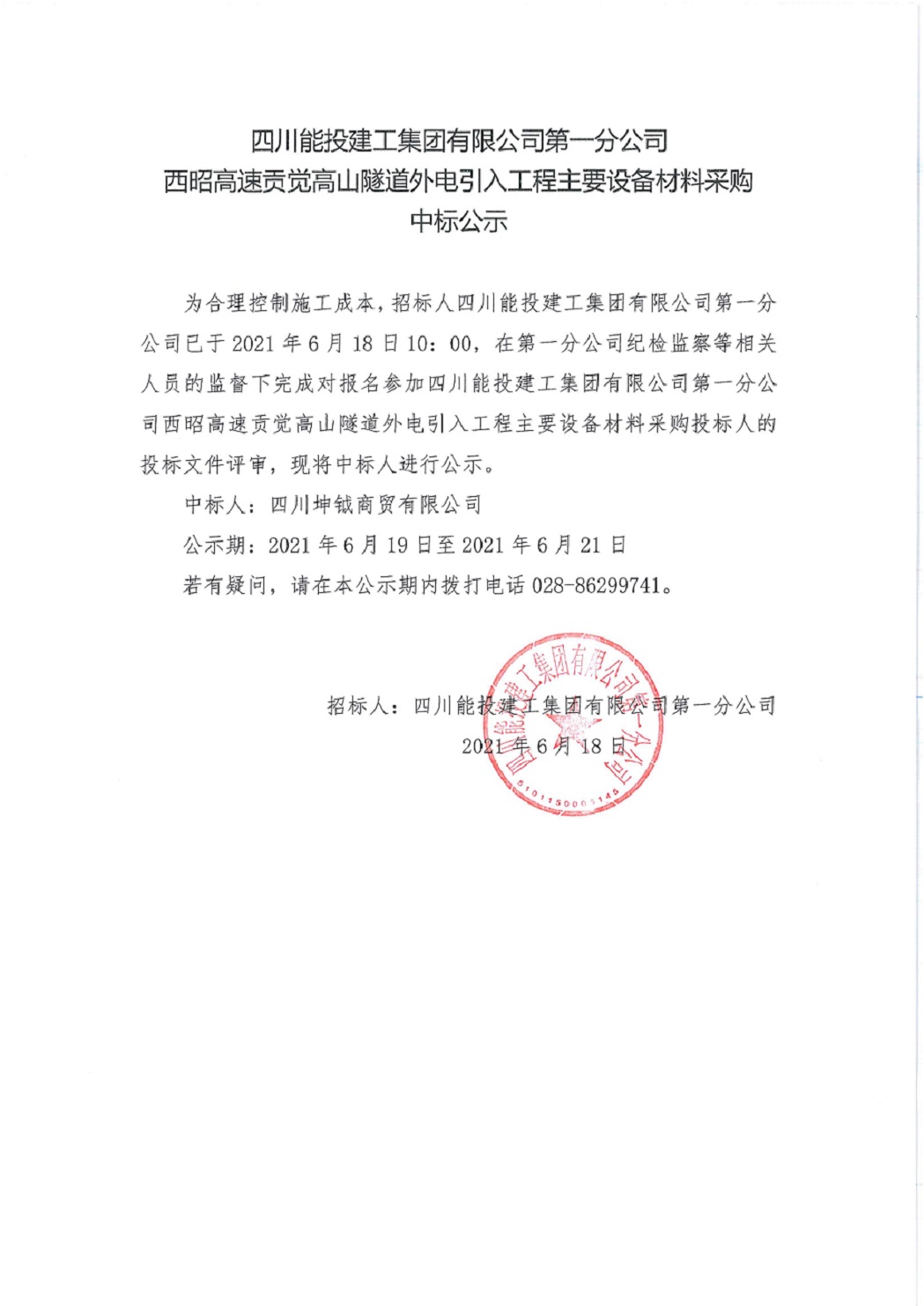 西昭高速贡觉高山隧道外电引入工程主要设备材料采购中标公示