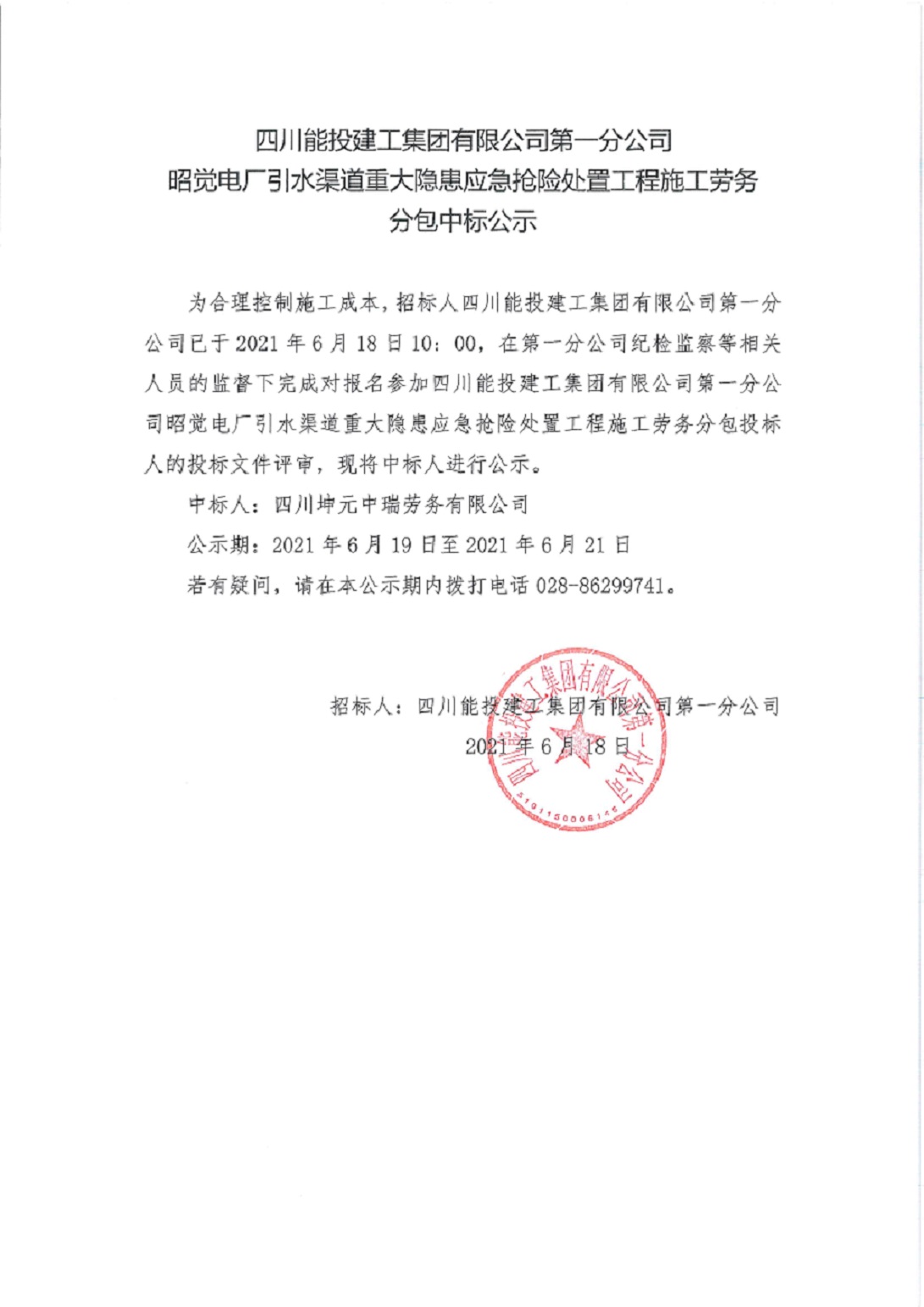 昭觉电厂引水渠道重大隐患应急抢险处置工程施工劳务分包中标公示