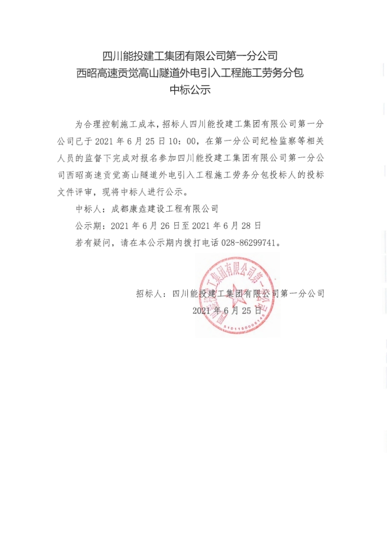西昭高速贡觉高山隧道外电引入工程施工劳务分包中标公示