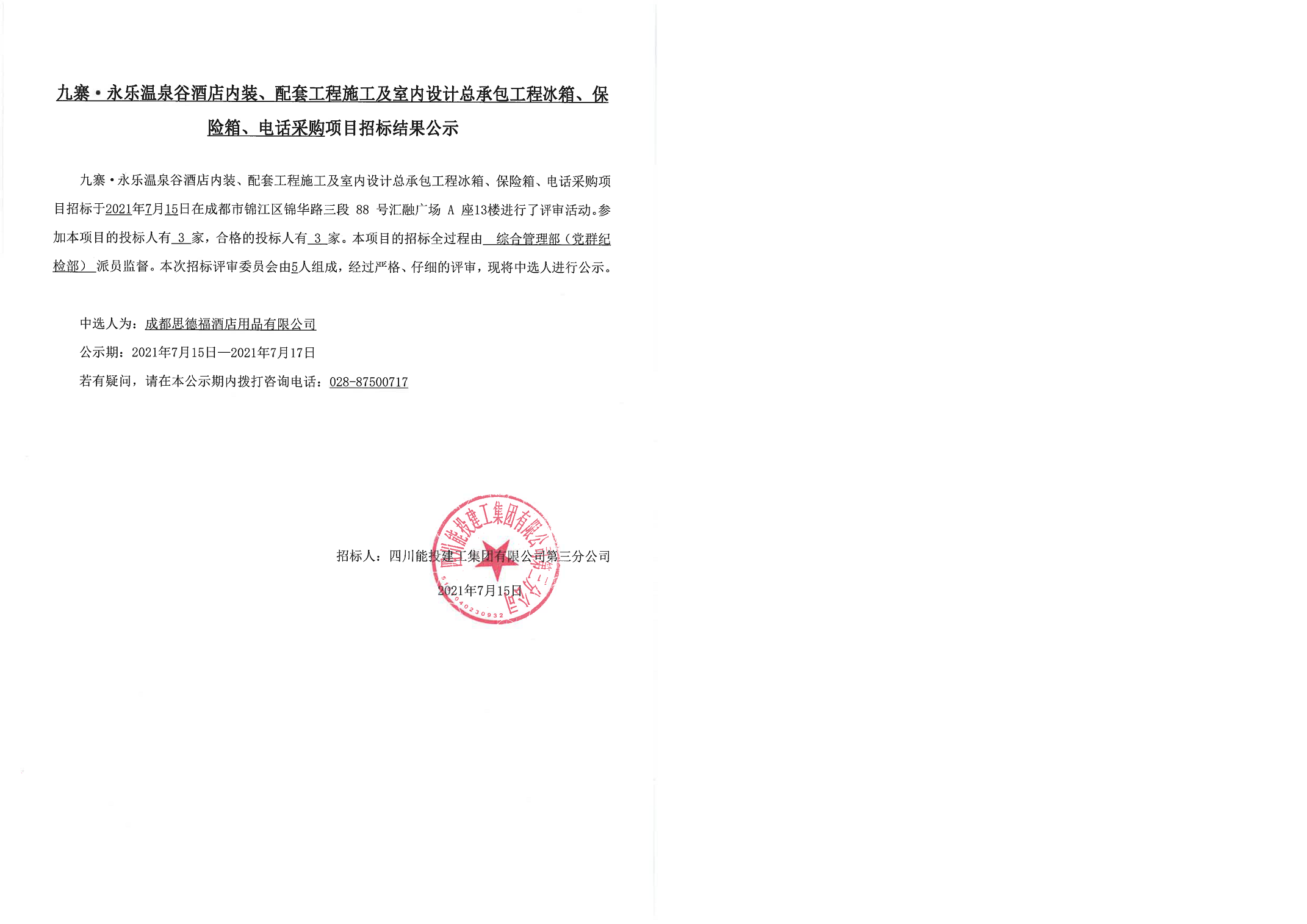 九寨·永乐温泉谷酒店内装、配套工程施工及室内设计总承包工程冰箱、保险箱、电话采购项目招标结果公示