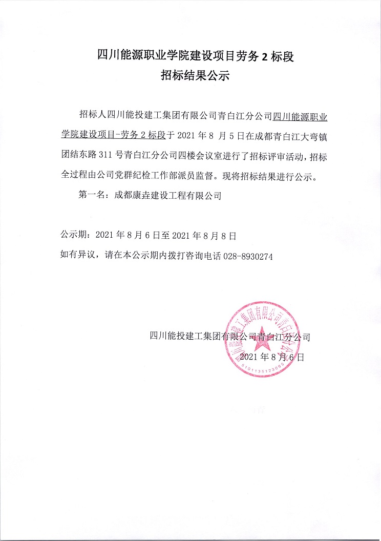 四川能源职业学院建设项目劳务2标段招标结果公示