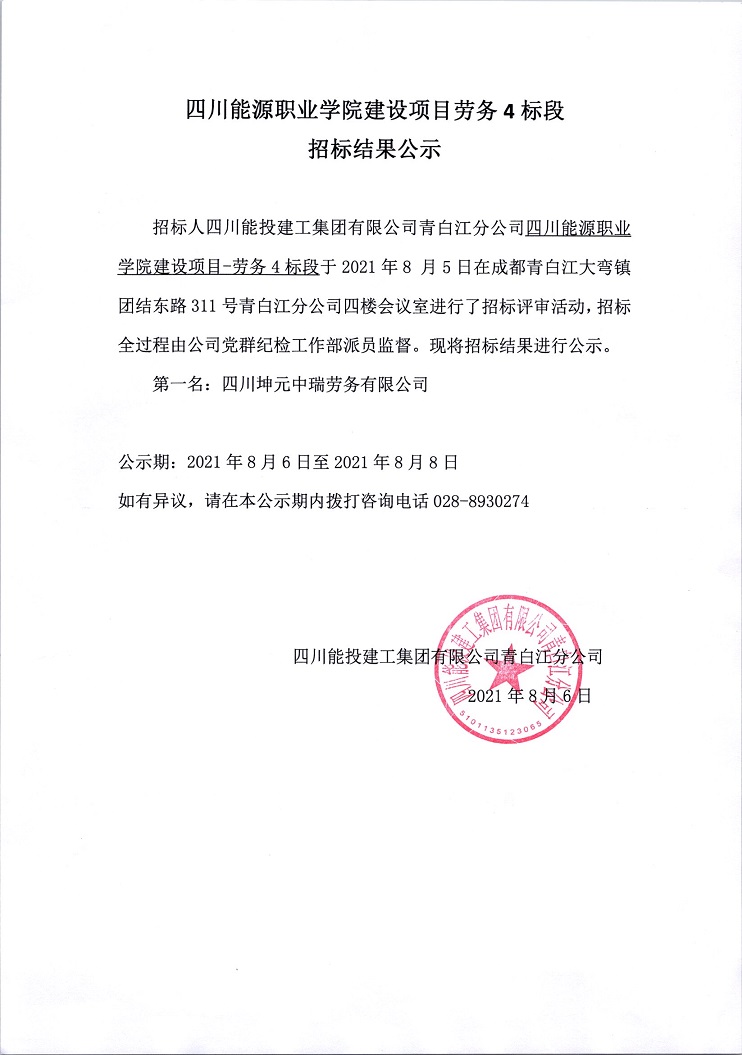 四川能源职业学院建设项目劳务4标段招标结果公示