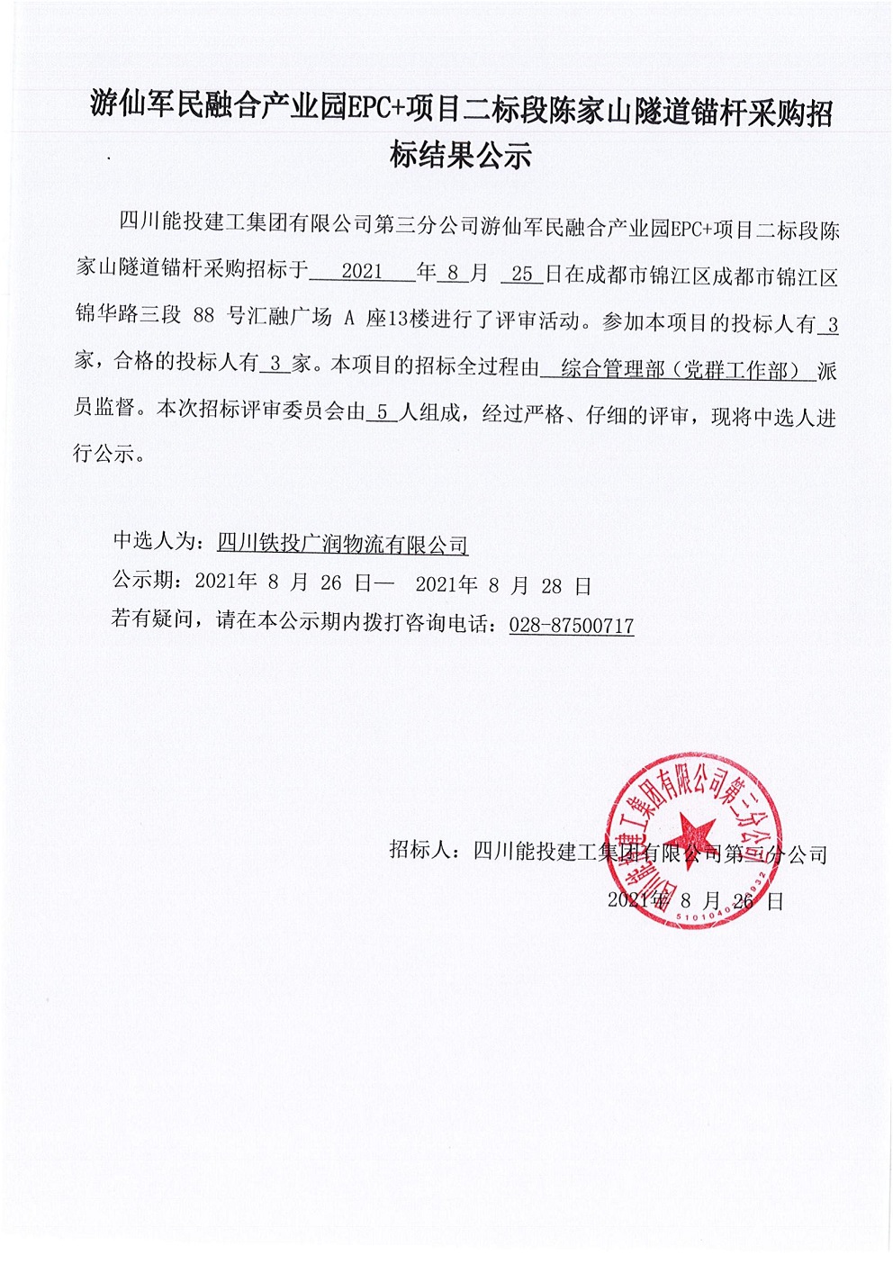 游仙军民融合产业园EPC+项目二标段陈家山隧道锚杆采购招标结果公示