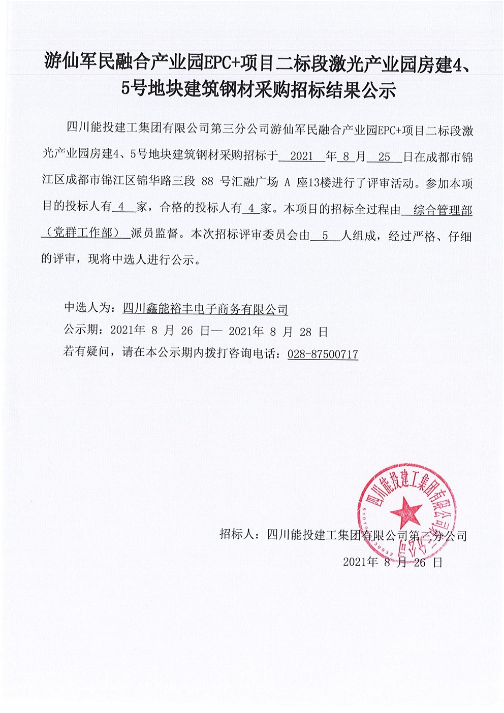 游仙军民融合产业园EPC+项目二标段激光产业园房建4、5号地块建筑钢材采购招标结果公示