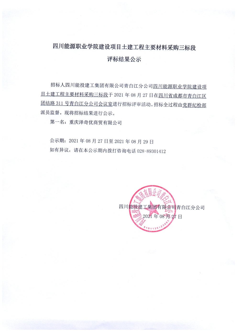 四川能源职业学院建设项目土建工程主要材料采购三标段评标结果公示