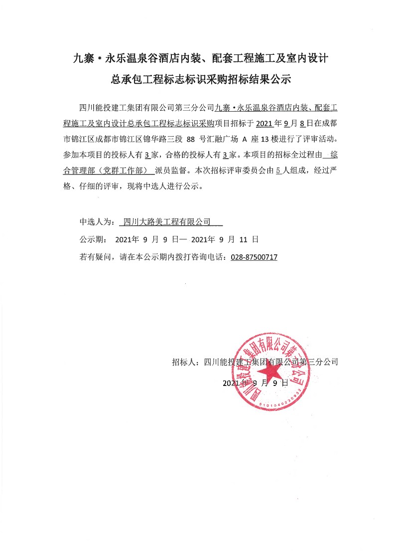 九寨·永乐温泉谷酒店内装、配套工程施工及室内设计总承包工程标志标识采购招标结果公示