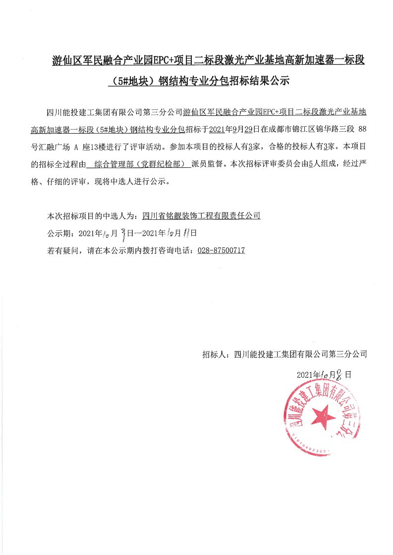 游仙区军民融合产业园EPC+项目二标段激光产业基地高新加速器一标段(5#地块)钢结构专业分包招标结果公示
