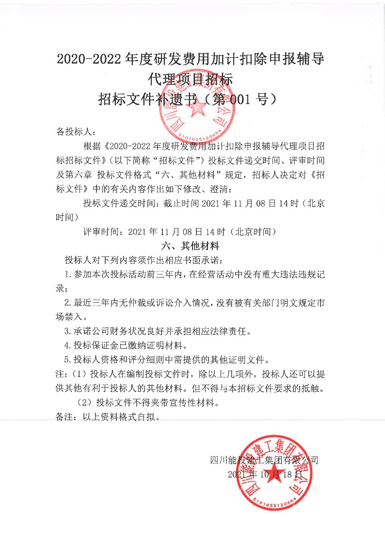 2020-2022年度研发费用加计扣除申报辅导代理项目招标 招标文件补遗书(第001号)