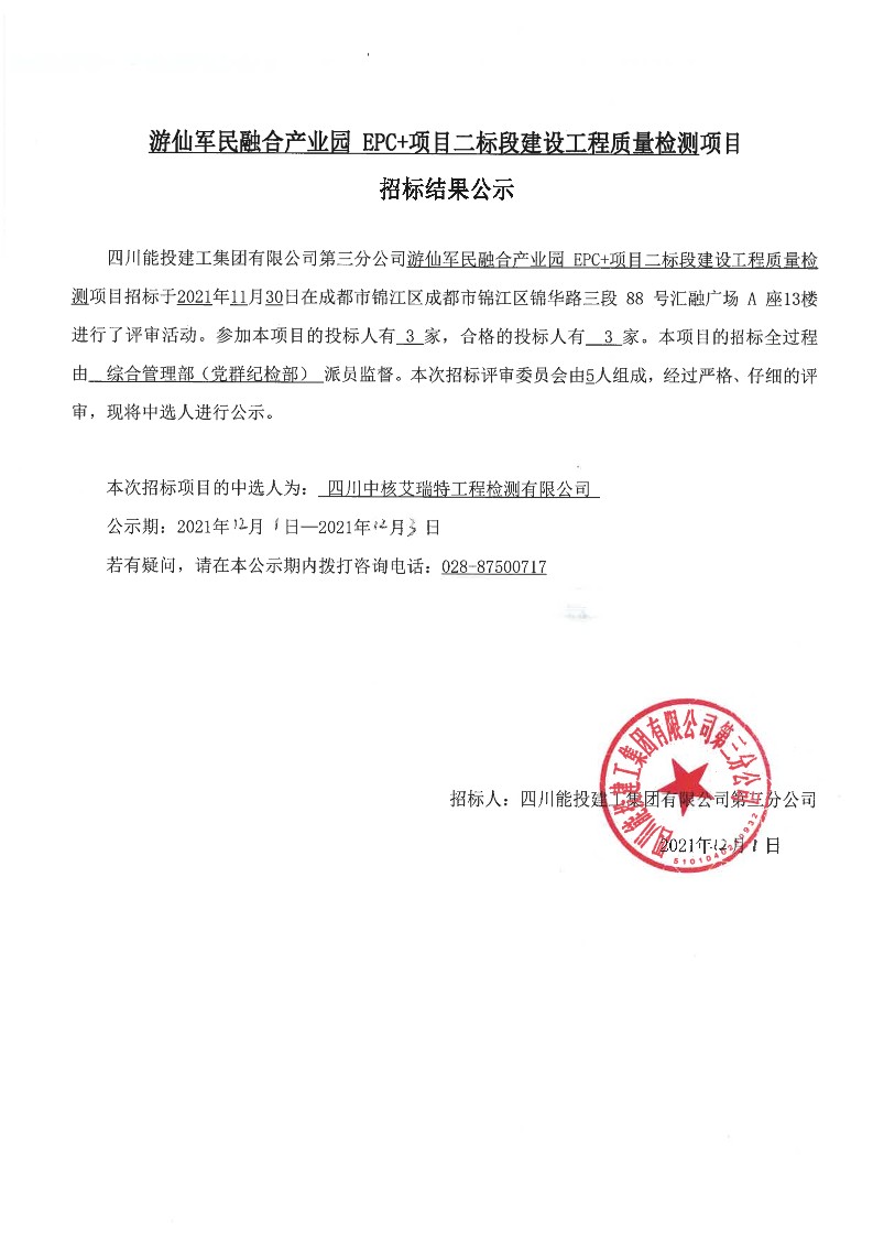 游仙军民融合产业园EPC+项目二标段建设工程质量检测项目招标结果公示