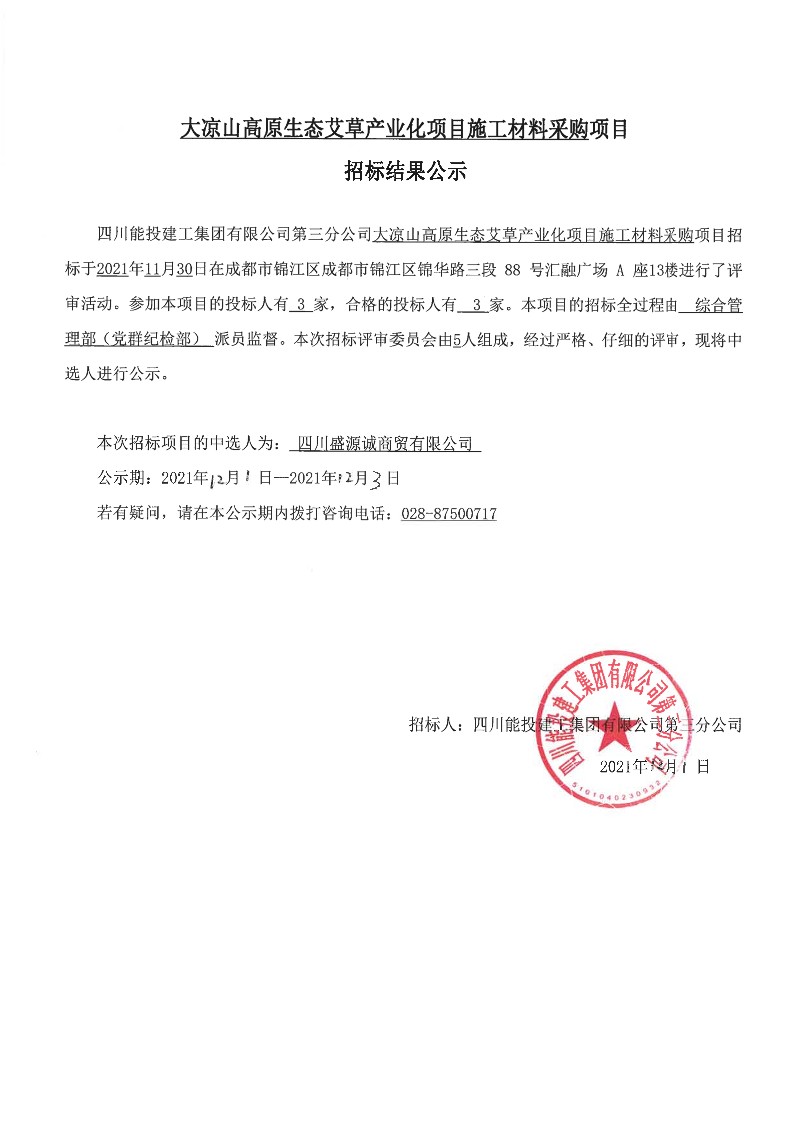 大凉山高原生态艾草产业化项目施工材料采购项目招标结果公示