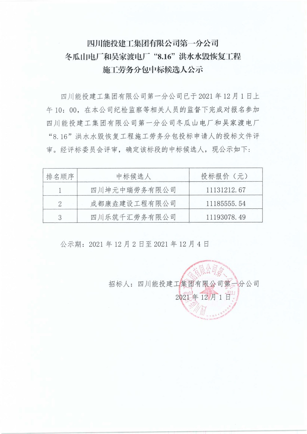 冬瓜山电厂和吴家渡电厂“8.16”洪水水毁恢复工程施工劳务分包中标候选人公示