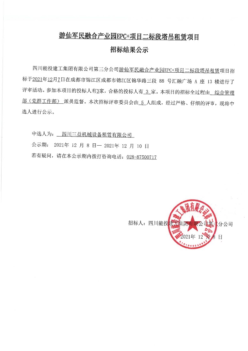 游仙军民融合产业园EPC+项目二标段塔吊租赁项目招标结果公示