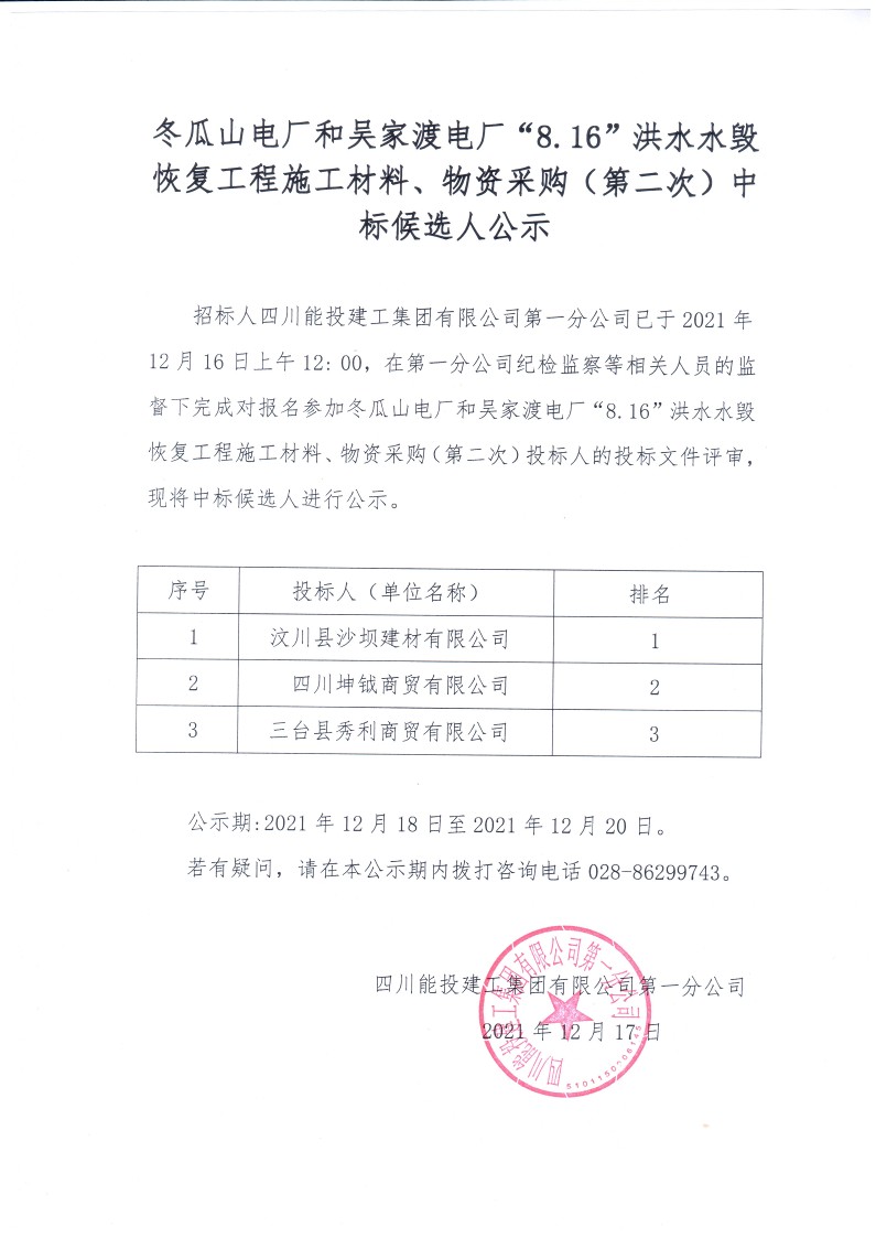 冬瓜山电厂和吴家渡电厂“8.16”洪水水毁恢复工程施工材料、物资采购(第二次)中标候选人公示
