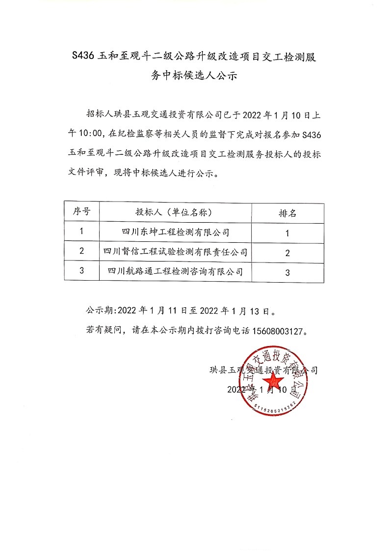 S436玉和至观斗二级公路升级改造项目交工检测服务中标候选人公示