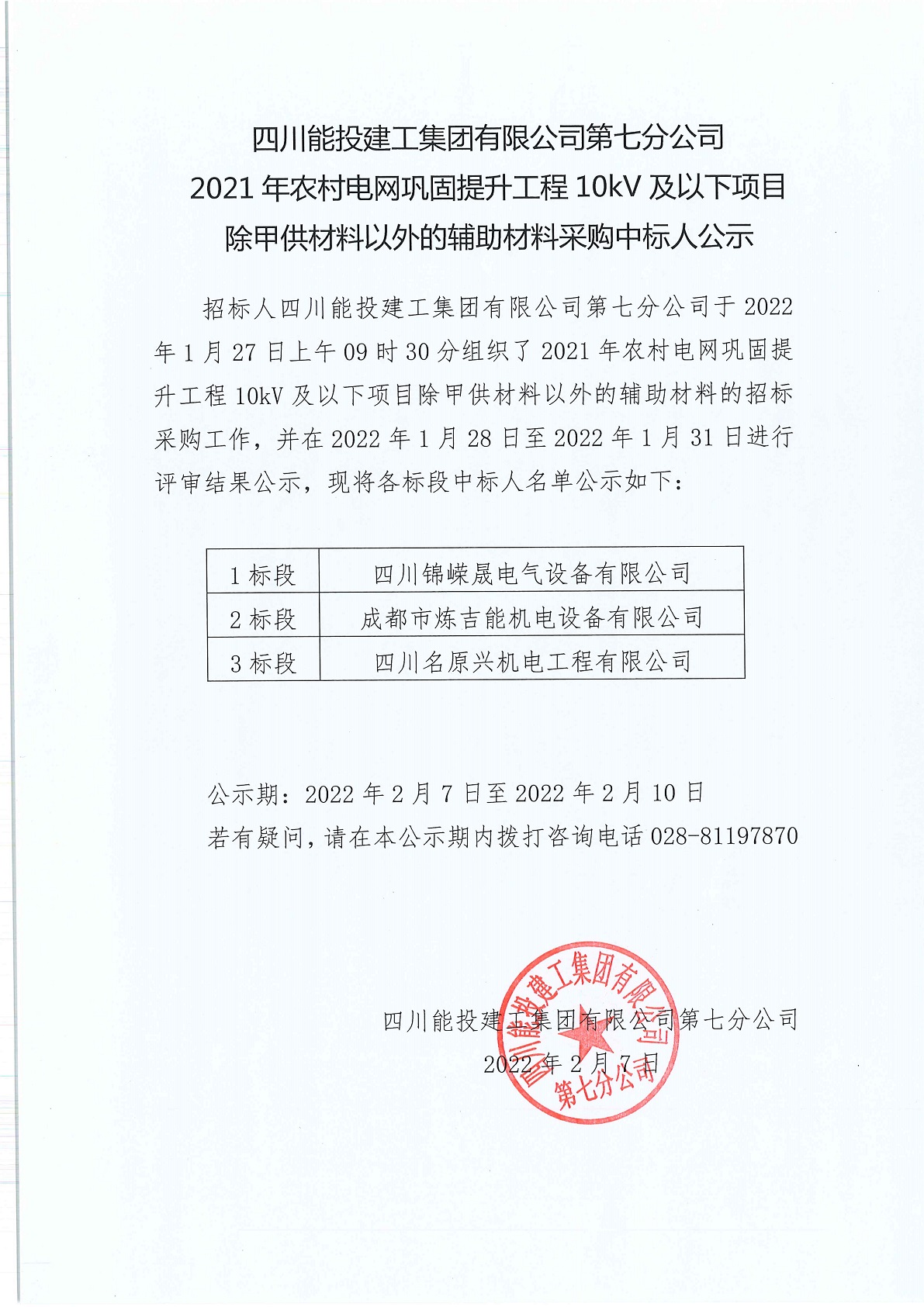2021年农村电网巩固提升工程10KV及以下项目除甲供材料以外的辅助材料采购中标人公示