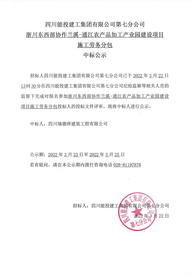 浙川东西部协作兰溪-通江农产品加工产业园建设项目施工劳务分包中标公示