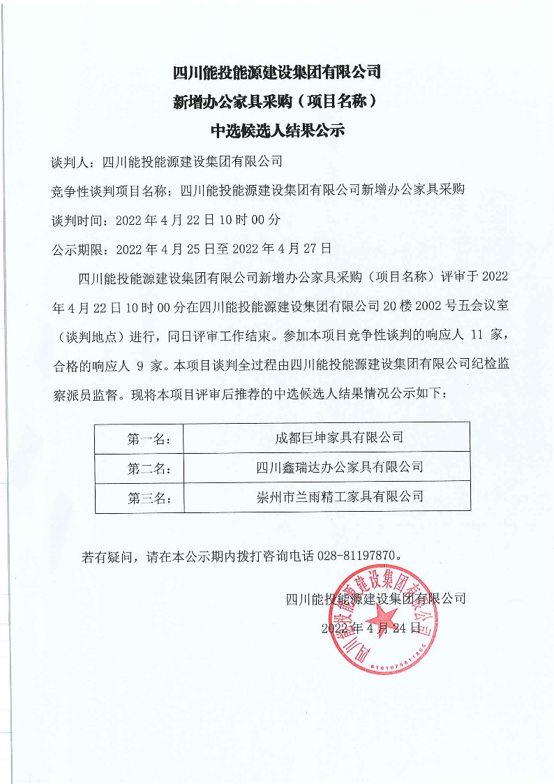 新增办公家具采购中选候选人结果公示