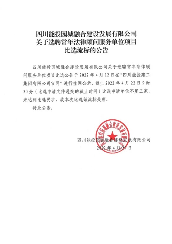 关于选聘常年法律顾问服务单位项目比选流标的公告