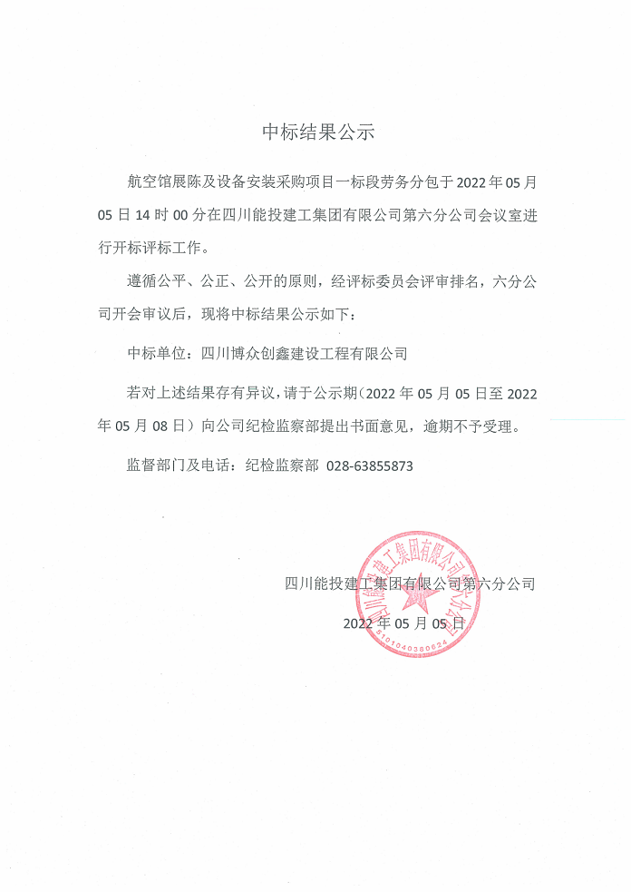 航空科技馆展陈及设备安装采购项目一标段劳务分包中标结果公示