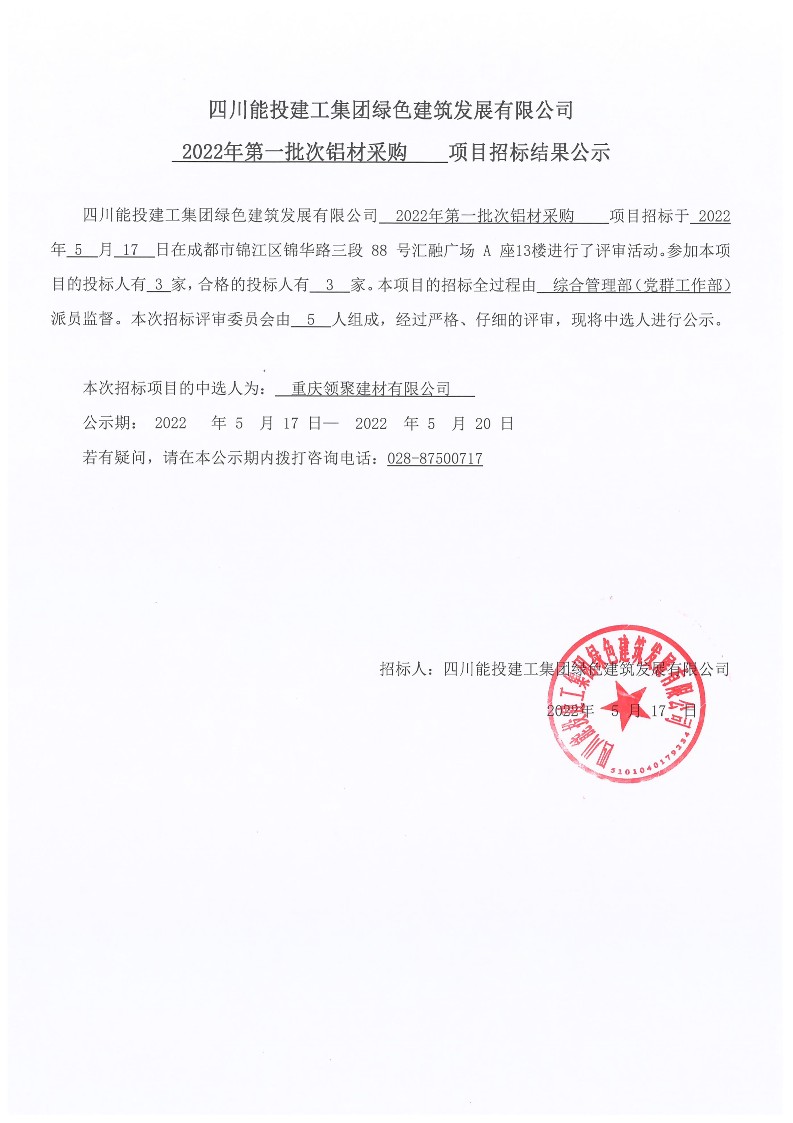 2022年第一批次铝材采购项目招标结果公示