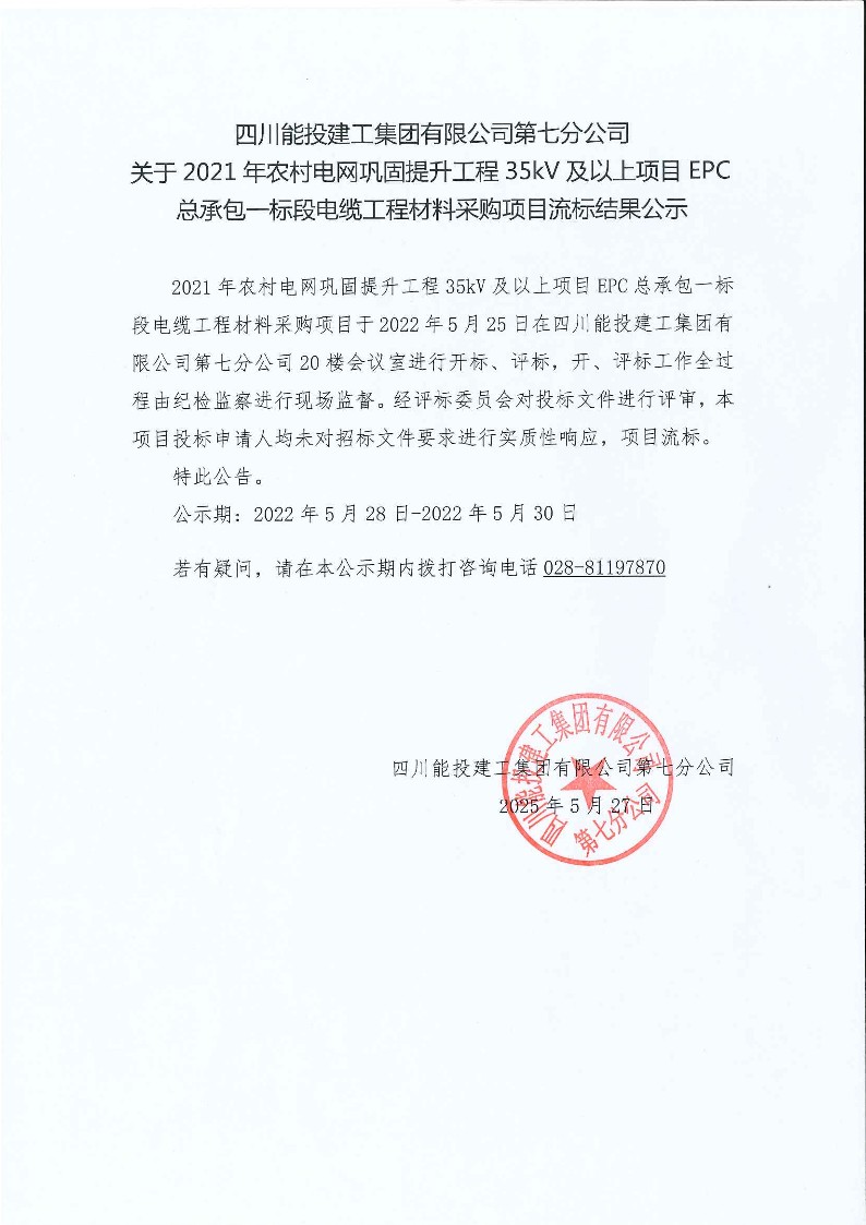2021年农村电网巩固提升工程35KV及以上项目EPC总承包一标段电缆工程材料采购项目流标公示