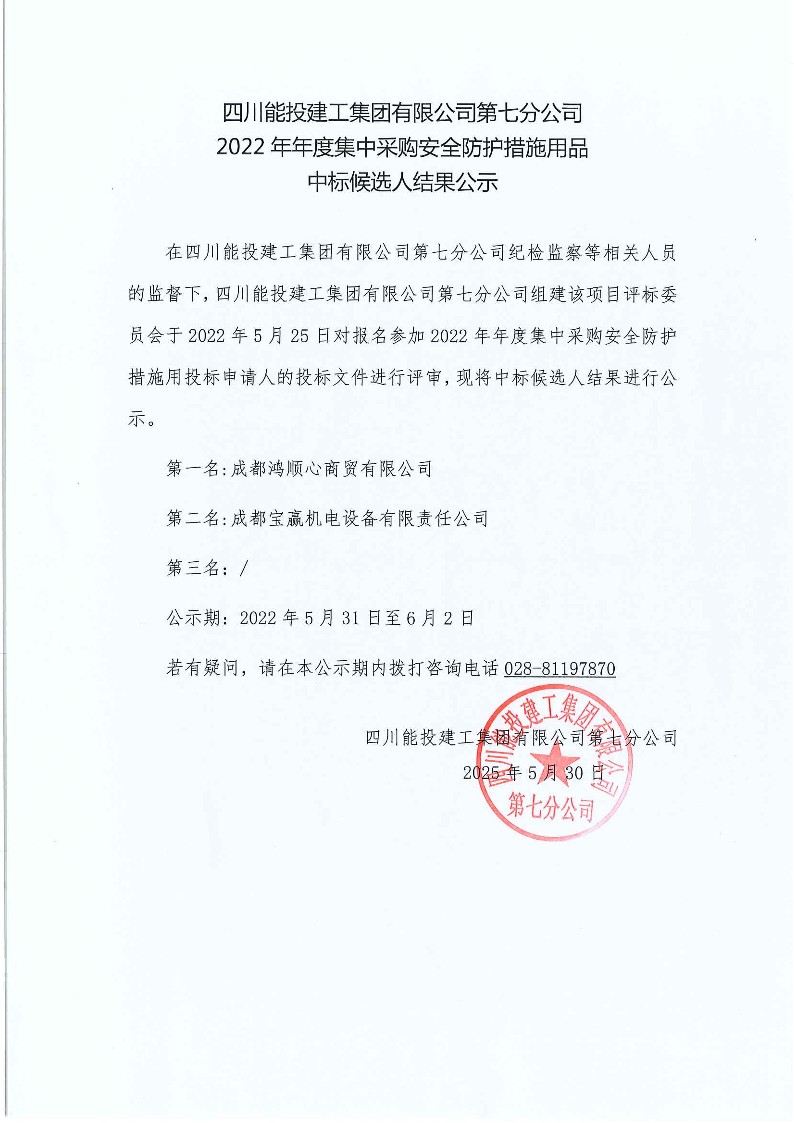 2022年年度集中采购安全防护措施用品中标候选人结果公示