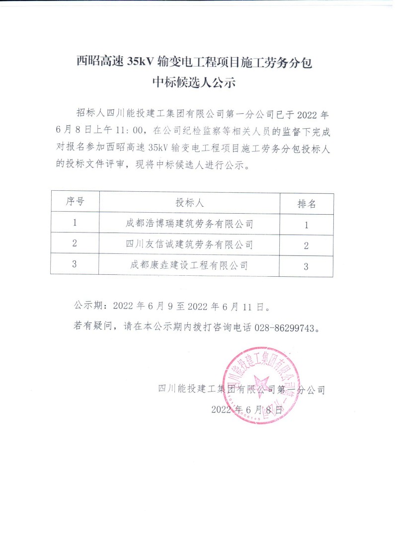 西昭高速35KV输变电工程项目施工劳务分包中标候选人公示