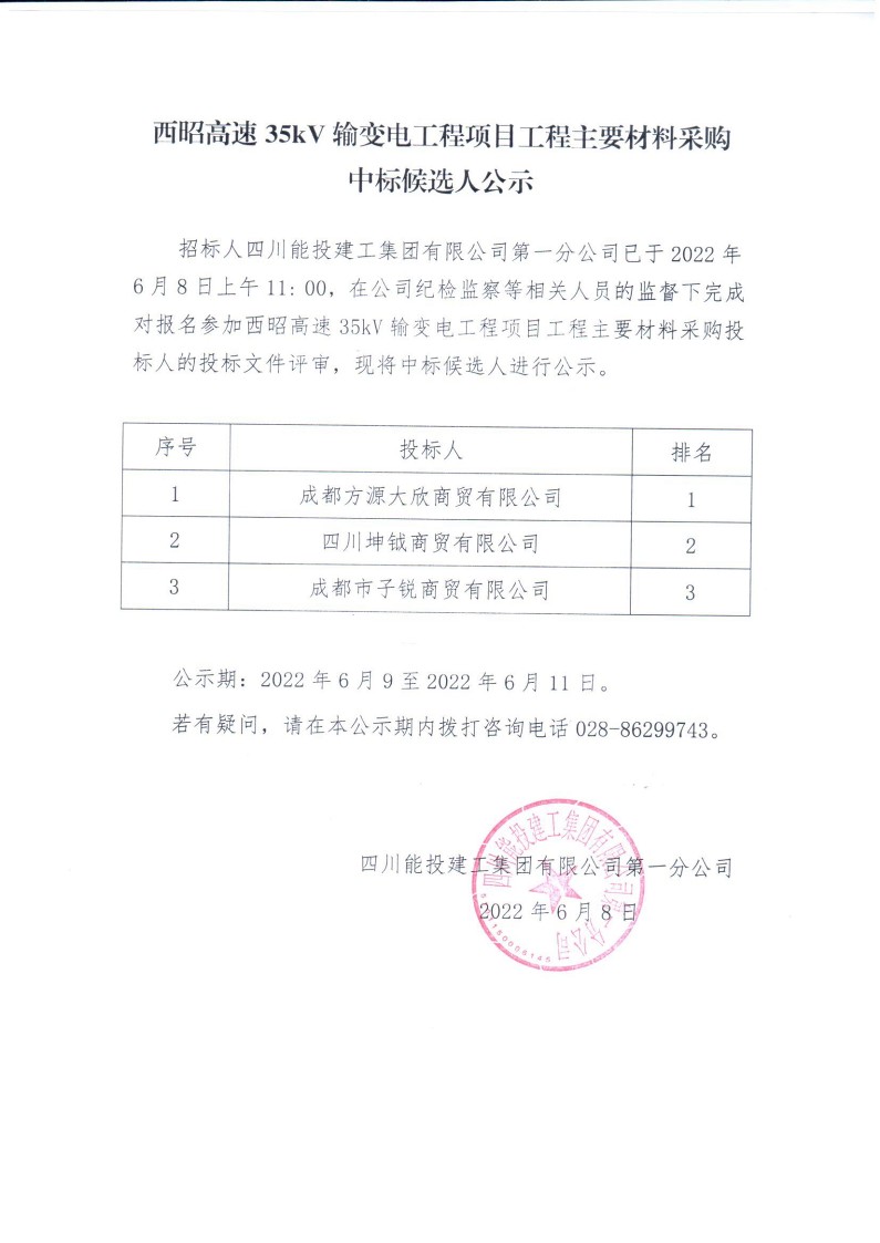 西昭高速35KV输变电工程项目工程主要材料采购中标候选人公示