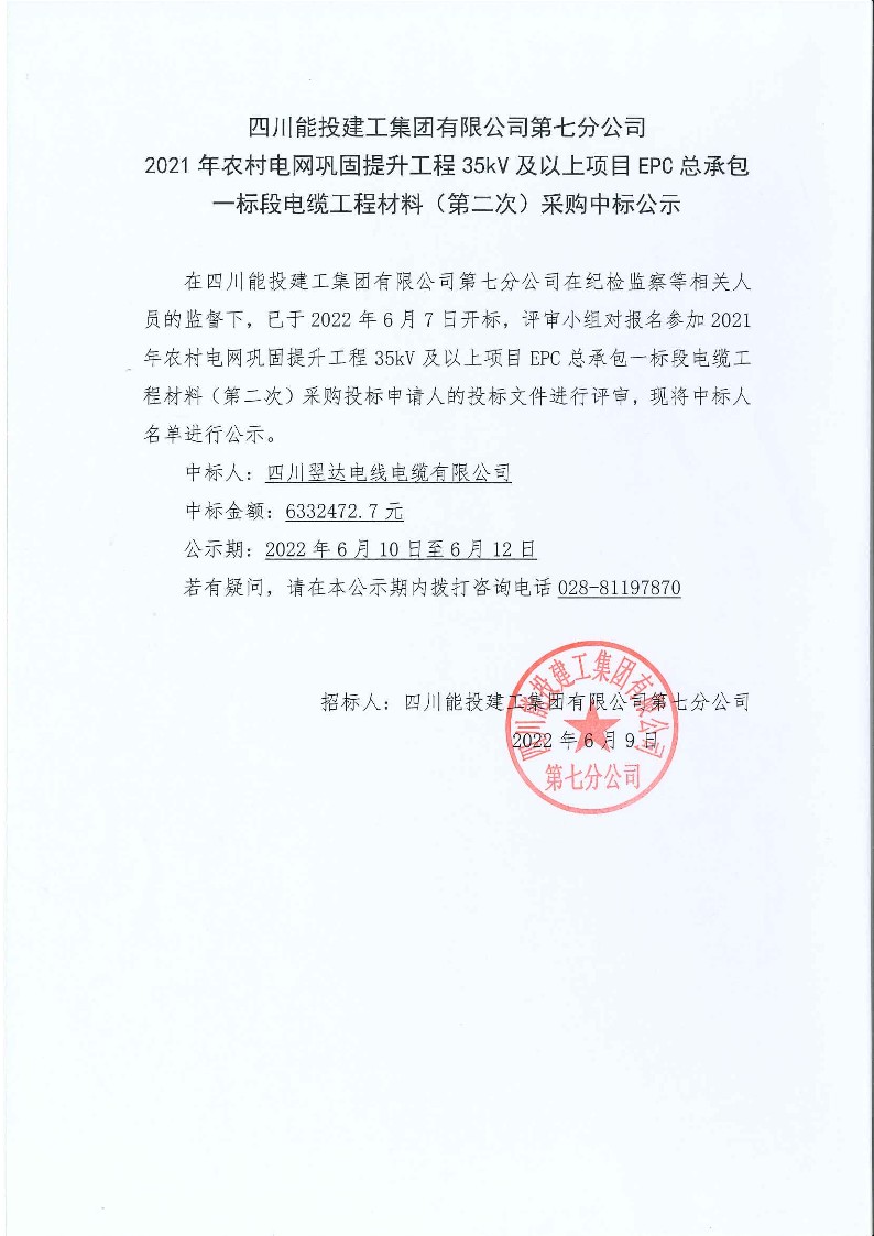 2021年农村电网巩固提升工程35KV及以上项目EPC总承包一标段电缆工程材料(第二次)采购中标公示