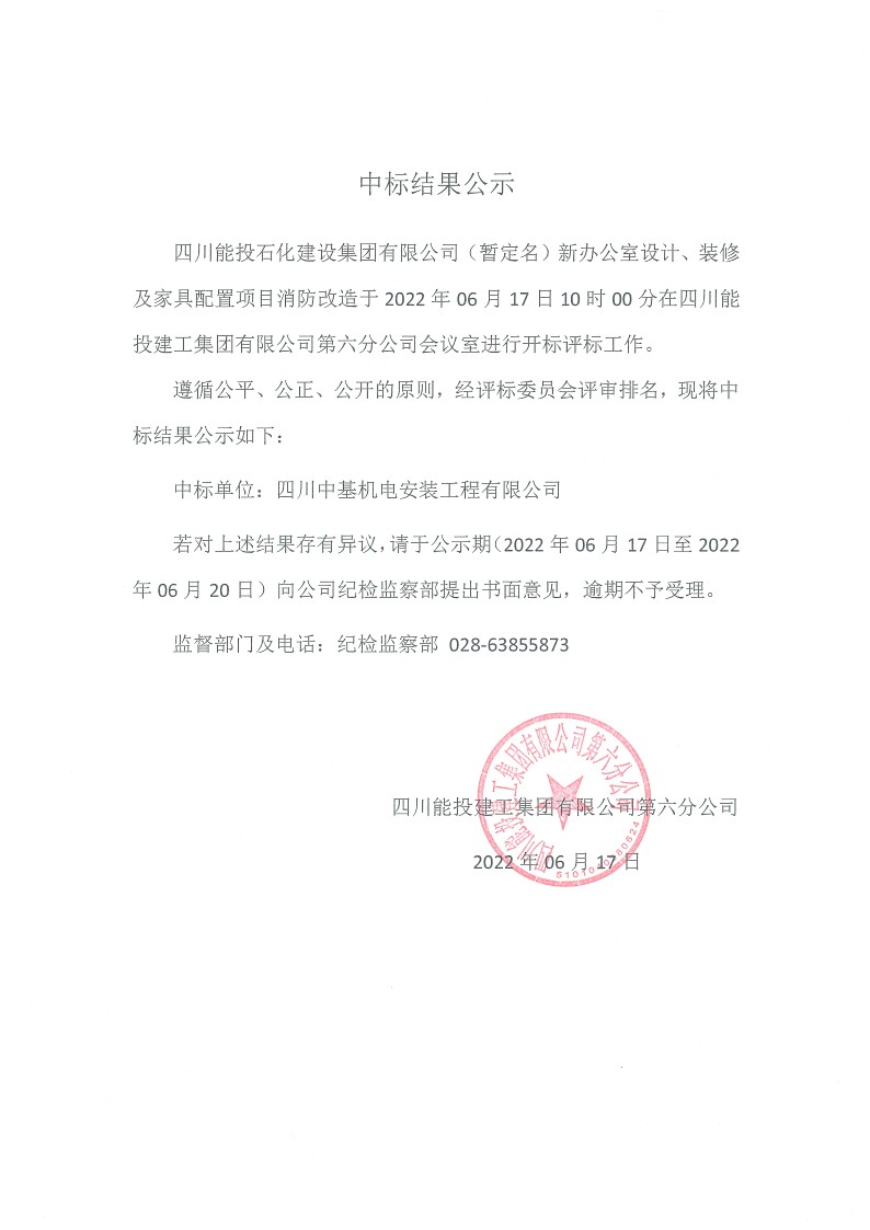 上一条:四川能投石化建设集团有限公司(暂定名)新办公室设计、装修及家具配置项目材料、家具采购中标结果公示