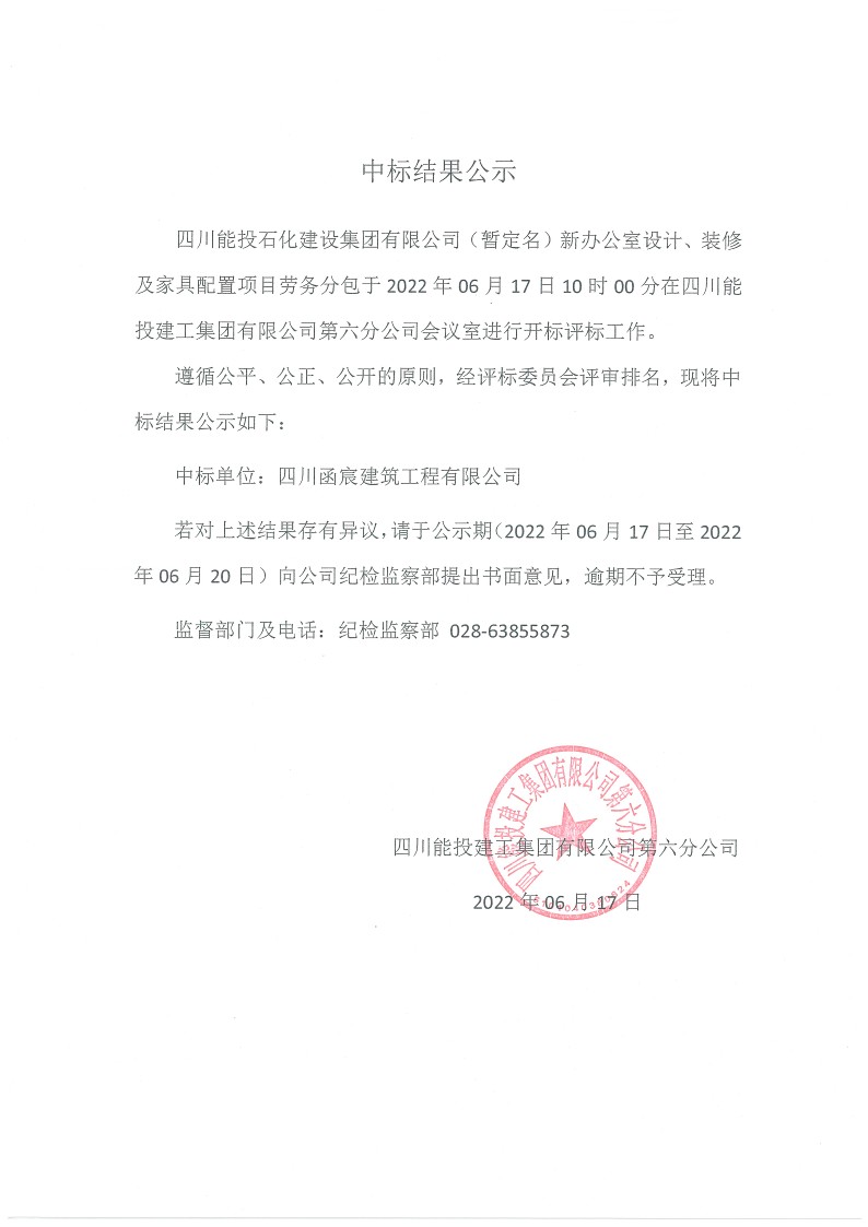 下一条:四川能投石化建设集团有限公司(暂定名)新办公室设计、装修及家具配置项目材料、家具采购中标结果公示