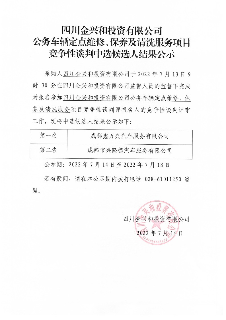 公务车辆定点维修、保养及清洗服务项目竞争性谈判中选候选人结果公示