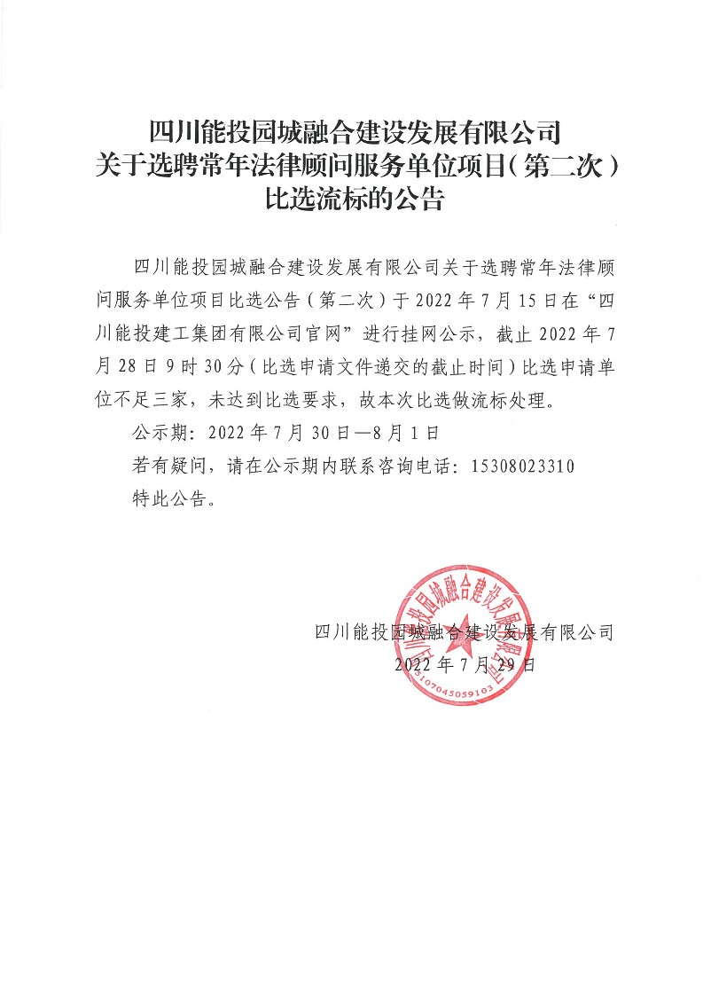关于选聘常年法律顾问服务单位项目(第二次)比选流标的公告