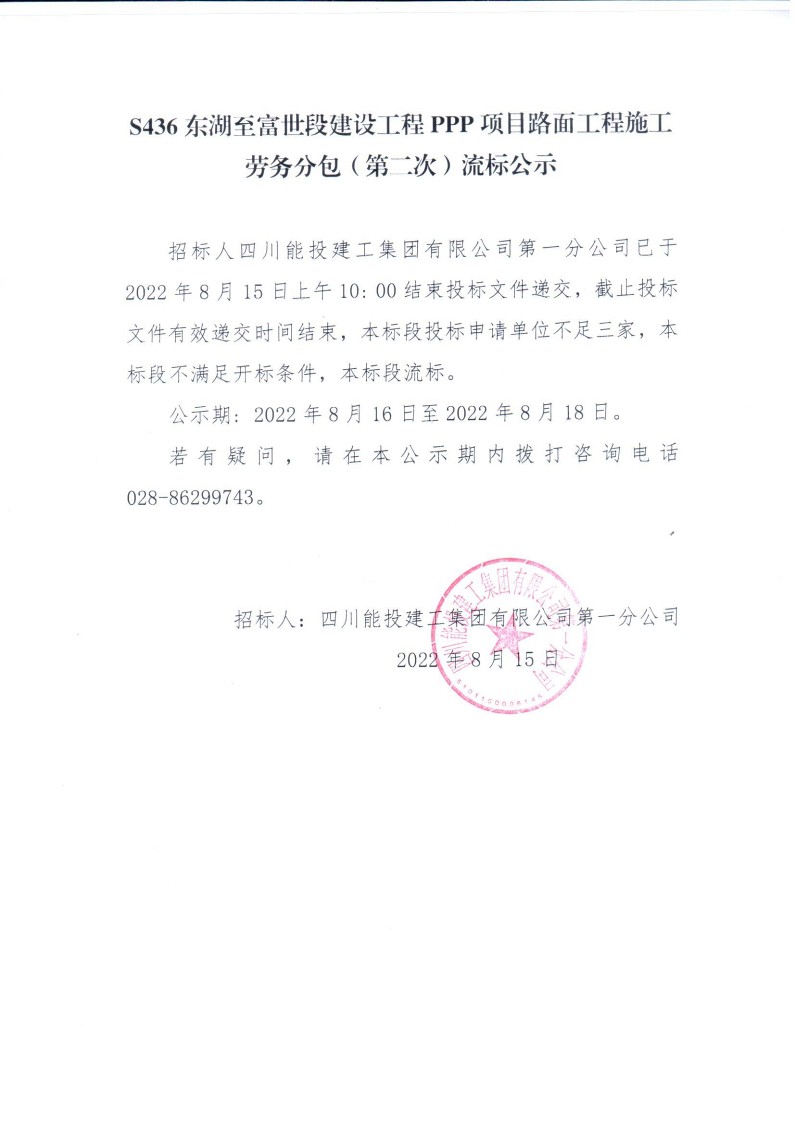 S436东湖至富世段建设工程PPP项目路面工程施工劳务分包(第二次)流标公示
