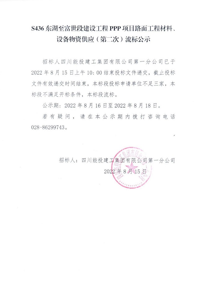 S436东湖至富世段建设工程PPP项目路面工程施工劳务分包(第二次)流标公示