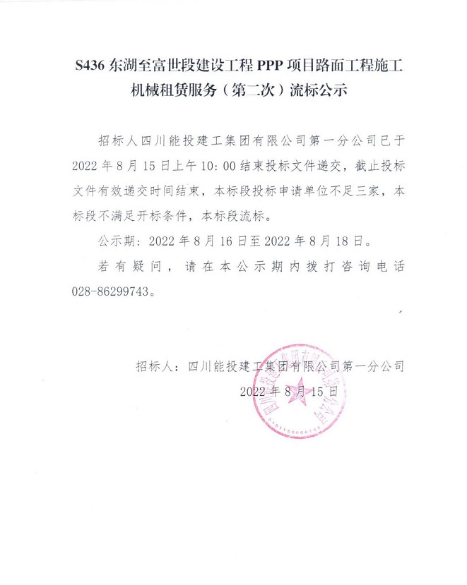 S436东湖至富世段建设工程PPP项目路面工程施工机械租赁服务(第二次)流标公示