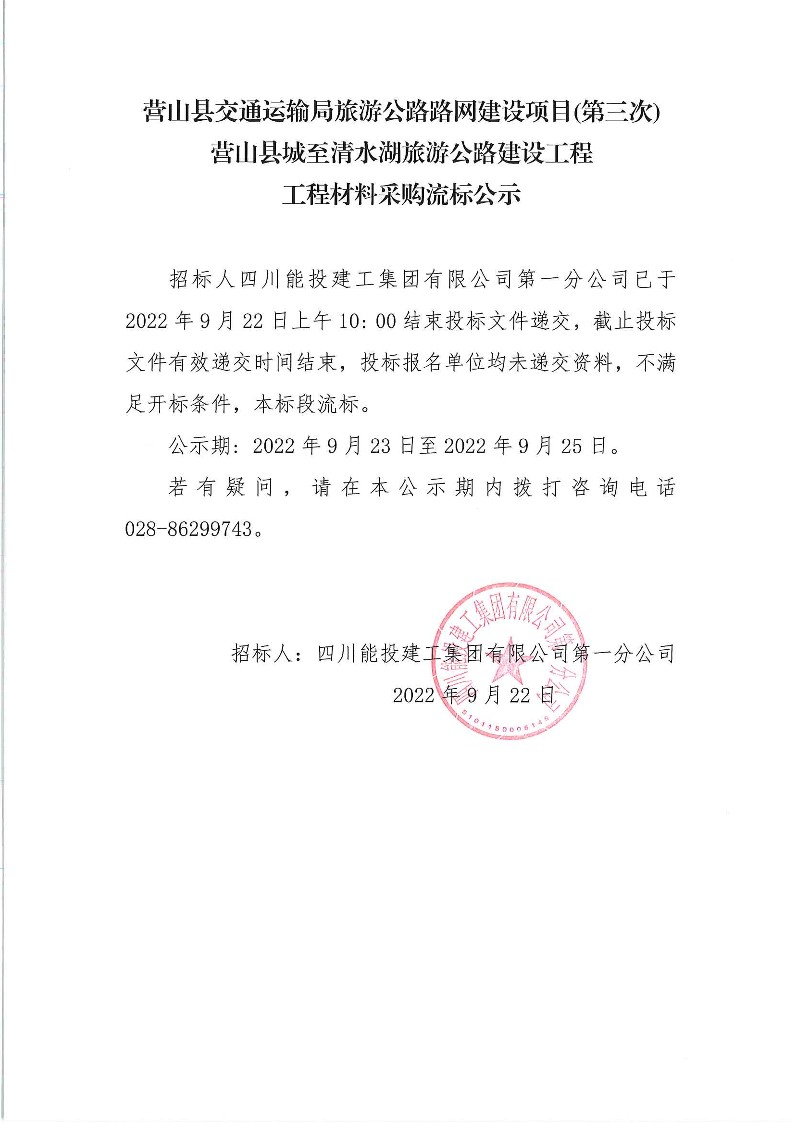 营山县城至清水湖旅游公路建设工程材料采购流标公示