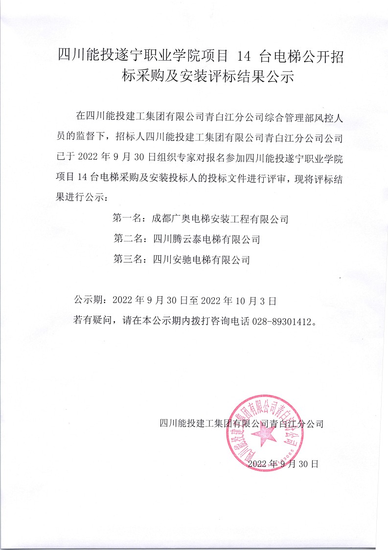 四川能投遂宁职业学院项目14台电梯采购及安装评标结果公示