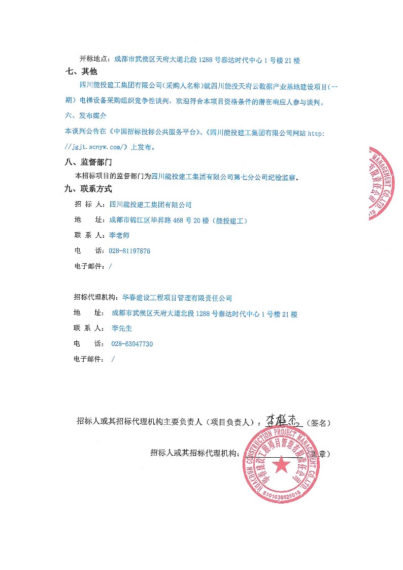四川能投天府云数据产业基地建设项目(一期)电梯设备采购(第二次)竞争性谈判公告