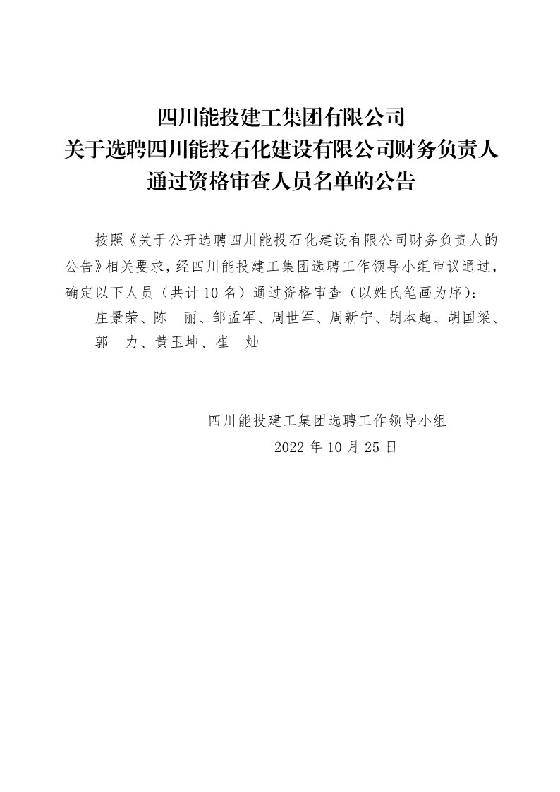 关于选聘四川能投石化建设有限公司财务负责人通过资格审查人员名单的公告
