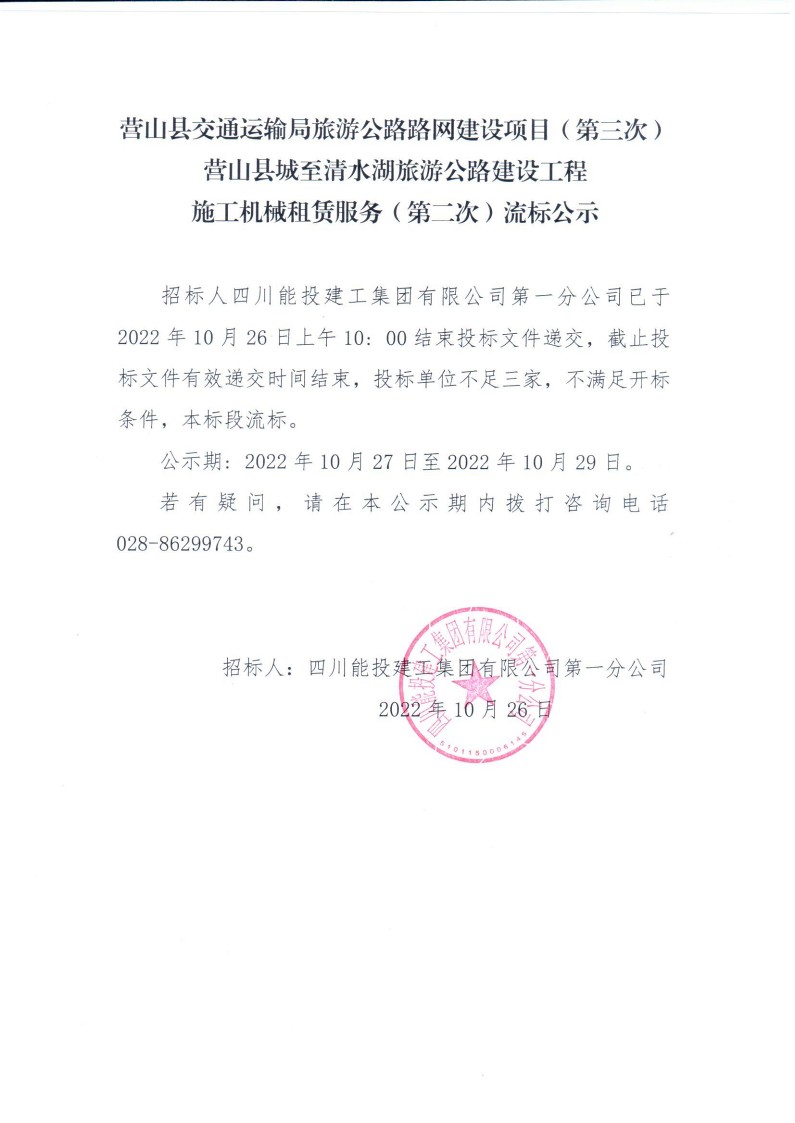 营山县城至清水湖旅游公路建设工程施工机械租赁服务(第二次)流标公示