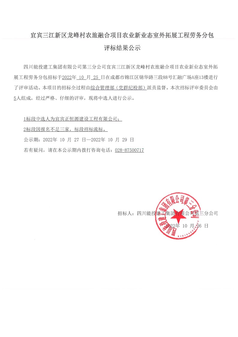 宜宾三江新区龙峰村农旅融合项目农业新业态室外拓展工程劳务分包结果公示