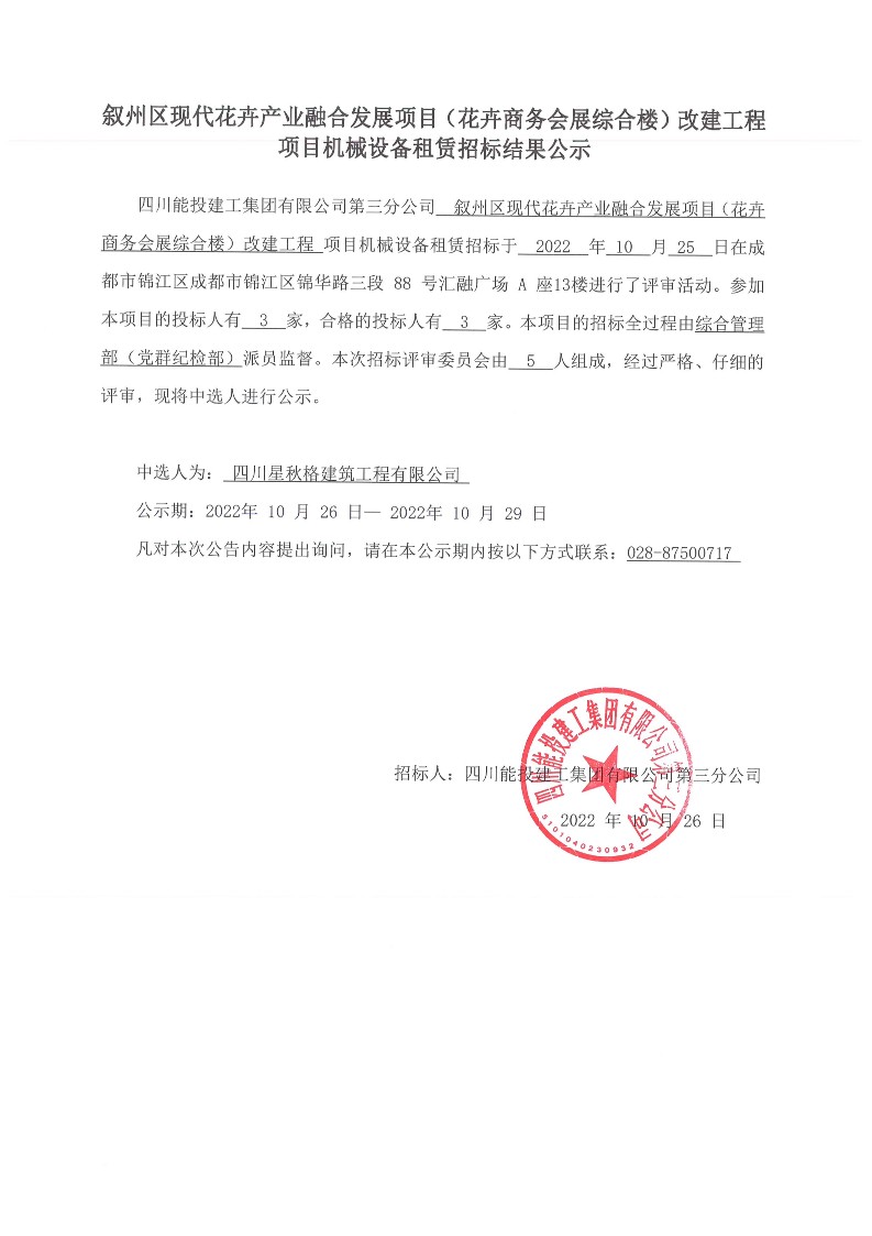 叙州区现代花卉产业融合发展项目(花卉商务会展综合楼)改建工程项目机械设备租赁招标结果公示