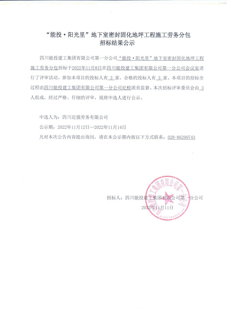 “能投·阳光里”地下室密封固化地坪工程施工劳务分包招标结果公示
