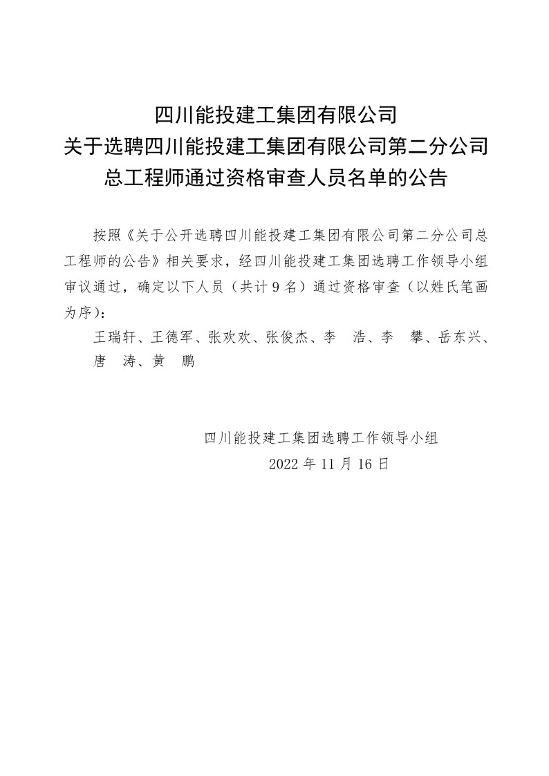 关于选聘乐动网页版第二分公司总工程师通过资格审查人员名单的公告
