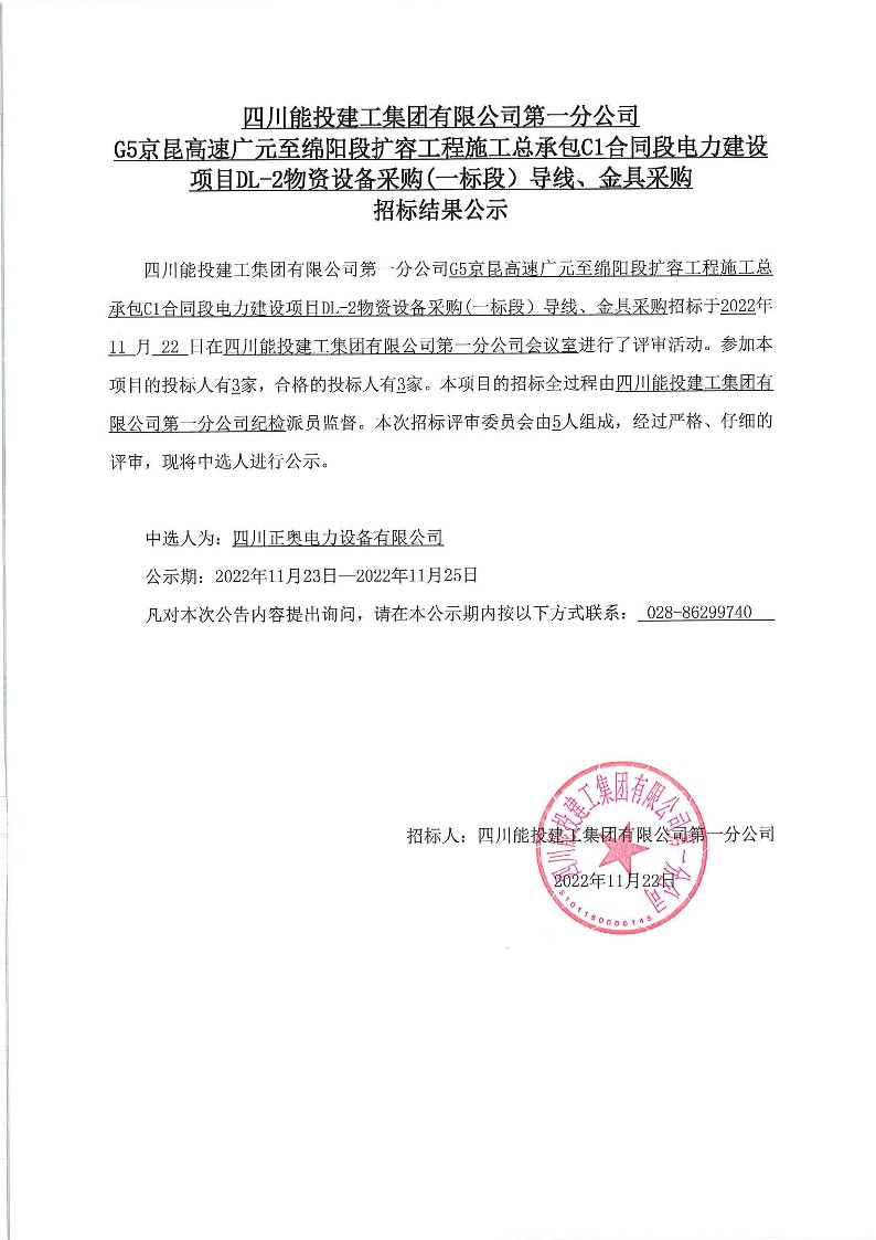 G5京昆高速广元至绵阳段扩容工程施工总承包C1合同段电力建设项目DL-2物资设备采购(一标段)导线、金具采购招标结果公示