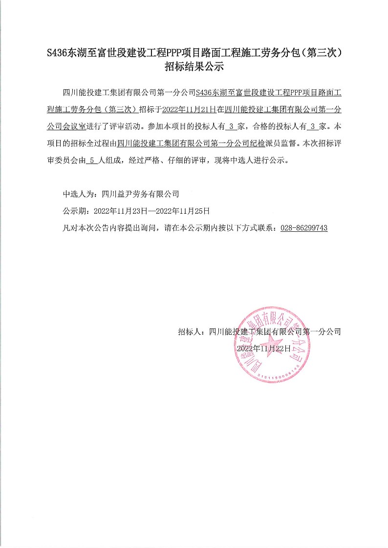 S436东湖至富世段建设工程PPP项目路面工程施工劳务分包(第三次)招标结果公示