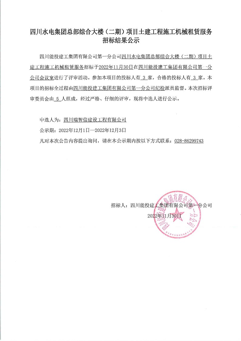 四川水电集团总部综合大楼(二期)项目土建工程施工机械租赁服务结果公示