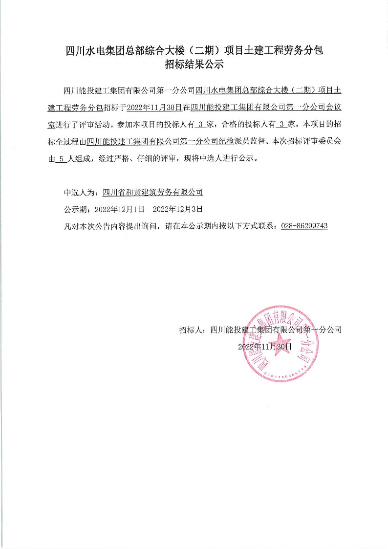四川水电集团总部综合大楼(二期)项目土建工程劳务分包结果公示