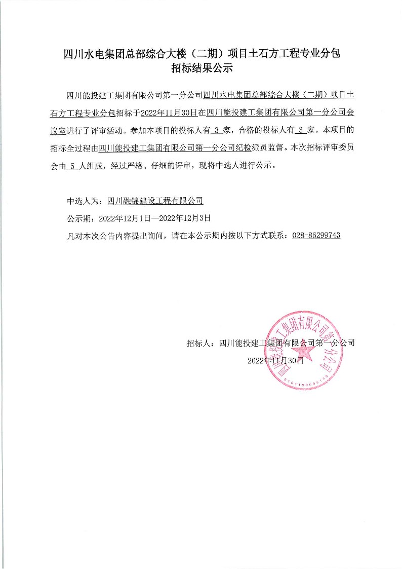 四川水电集团总部综合大楼(二期)项目土石方工程专业分包结果公示